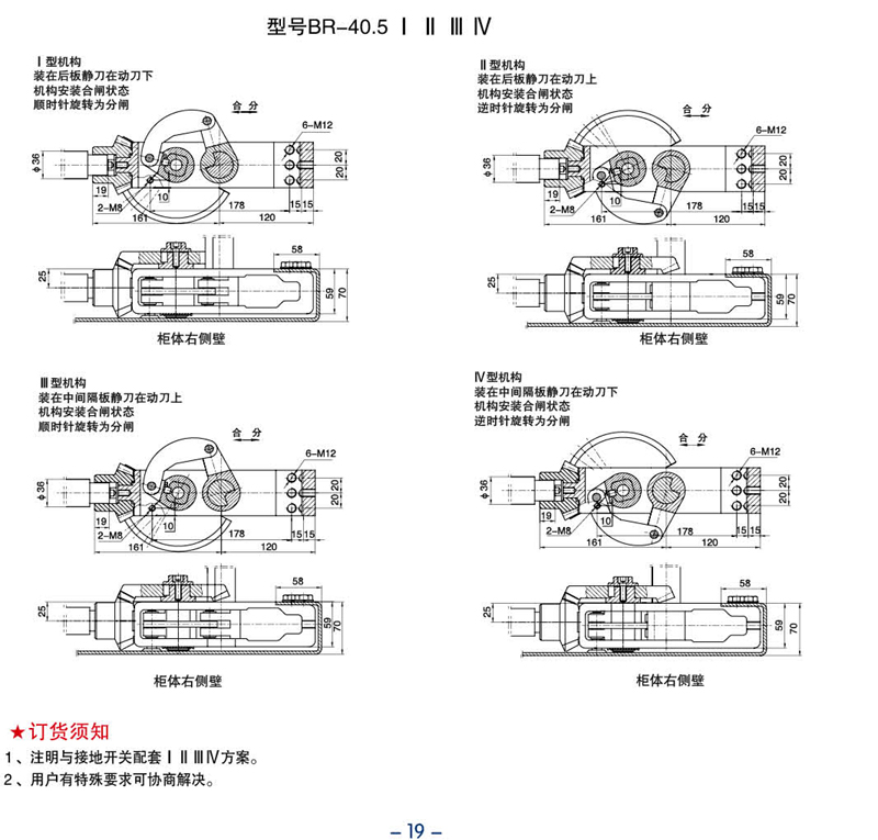 3.本操作機(jī)構(gòu)按圖所示為分閘狀態(tài).按接地開關(guān)安裝方式配套為ⅠⅡ Ⅲ Ⅳ型機(jī)構(gòu)